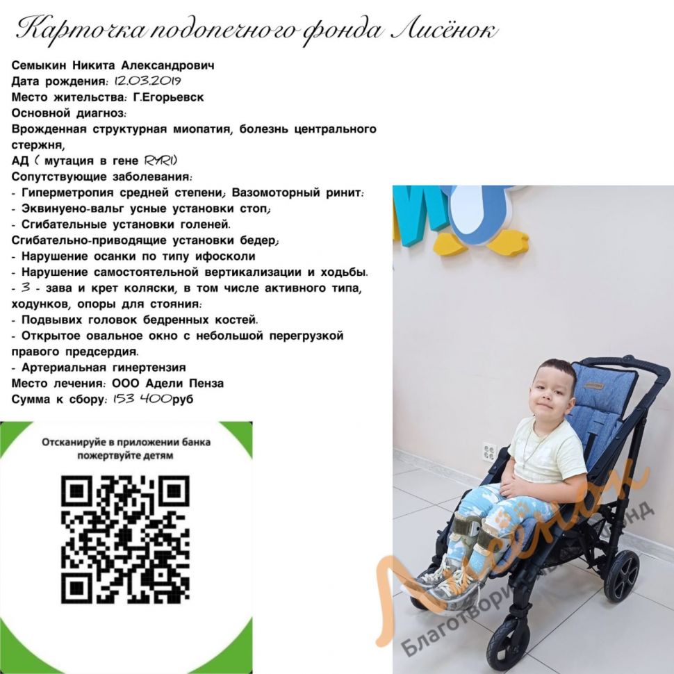 Никита в нашей семье второй ребенок. Никита родился 12 марта 2019 года совершенно здоровым ребенком,9 баллов по шкале Ангар. Нас выписали домой , мы были счастливы и ничего не предвещало беды. Никита развивался хорошо, в 3 месяца держал голову. В 6 месяцев мы стали замечать, что у нашего сына совсем нет опоры на ноги, он не ползал, не сидел и даже, не было предпосылок на это. Обращались к нескольким неврологам. Но ближе к году стало ясно, что есть задержка в физическом развитии. В ноябре 2020года мы были госпитализированы в Научно-Исследовательский Клинический Институт Педиатрии им.академика Ю.Е. Вельтищева г.Москва. Там мы прошли обследование, был взят генетический анализ, результат которого скрестив пальцы, мы ждали 4,5 месяца . Диагноз-нервно мышечное заболевание-болезнь центрального стержня(мутация в гене RUR 1 де ново) был подтвержден.Ребенок страдает серьезным генетическим заболеванием: ослаблены мышцы, ходить он на данный момент не может. Детей с таким диагнозом как у Никиты, в нашей стране около 10 человек. Конечно, когда врачи поставили такой диагноз, то мы все были в шоке, пребывали в отчаянии. Но всё равно решили бороться за нашего сыночка. Ни на секунду не было мыслей опустить руки, ведь надо двигаться дальше и делать всё возможное и не возможное для здоровья нашего малыша. Никите сейчас 5 лет. Он очень сильный духом, целеустремленный, волевой и терпеливый ребенок. А еще Никита очень умный, любит рисовать, смотреть мультфильмы, играть с братом в различные игры. Активный и живой ребенок, которому так хочется ходить самому. «Вот когда я буду ходить ножками», - очень часто повторяет Никита. И это делает и ему, и нам стимул двигаться дальше, для достижения поставленных целей. Никита очень радуется, когда у него получается что-то новое, что он раньше не мог сделать и начинает это повторять вновь и вновь. Врачи дают гарантию в том, что Никита может встать на ножки и научиться ходить, но для этого нам нужно много работать: специальная реабилитация, домашние тренировки - залог успеха Никиты. Нами были пройдены неоднократные курсы реабилитации в центре «Адели» город Пенза, прогресс после которого был очевиден - Никита очень окреп в руках специалистов. Появились новые навыки. Но у Никиты имелись контрактуры, которые ему мешали дальше двигаться. По рекомендациям врачей Никите была проведена операция в сентябре 2024г.После операции Никите необходима специализированная, длительная, дорогостоящая реабилитация, чтобы его навыки закрепились и он восстановился. В ноябре 2024г мы прошли очередной курс реабилитации в ФОЦ АДЕЛИ ПЕНЗА и остались очень довольны, после операции и стольких усилий специалистов Никита начал ходить с ходунками, начал стоять. Мы маленькими ,но верными шагами идем к заветной цели. Благодаря постоянным реабилитациям у Никиты положительная динамика после каждого курса. До заветной цели остается совсем немного, мы не можем назад. Сумма для нас большая. Курс реабилитации составляет 153400т.р. Проходить реабилитации необходимо, для того чтобы закрепить старые и получить новые навыки. Мы очень надеемся на Вашу поддержку, ведь вместе мы сможем исполнить мечту маленького Важного человека-Никиты! Помогите нам, пожалуйста. Своими силами сложно, через каждые три месяца ездить и оплачивать курсы реабилитации. Нам очень нужна Ваша помощь, чтобы по